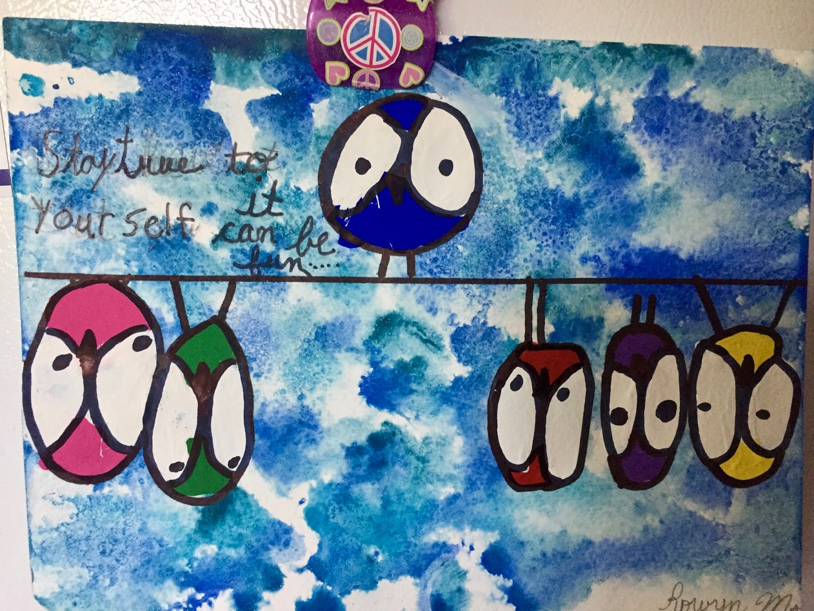 HBear was challenged to make a picture and put positive words on it. All the kids were tasked the same thing. Same picture, different words. All the kids drew their owls sitting on a branch with one oddball hanging below. Not HBear! She put all of her owls hanging from the branch and just 1 on top! She asked her teacher if she could and her teacher said, “I’ve never thought about it that way. Of course you can.” 💕