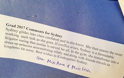 After that all the graduates received their certificate, scrapbook, and a end-of-the-year book about kindergarten. The teachers prepared a little something to say about each of the kids, it was so freaking adorable! For SBean they said,
