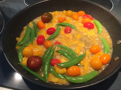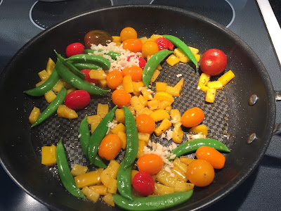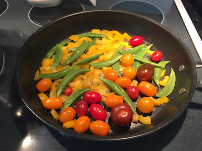 Melt 2 tablespoons margarine in a large skillet over medium heat. Add the tomatoes, the peppers, the peas and 1 teaspoon salt and 1/2 teaspoon pepper and cook until the veggies soften, about 4 minutes.
