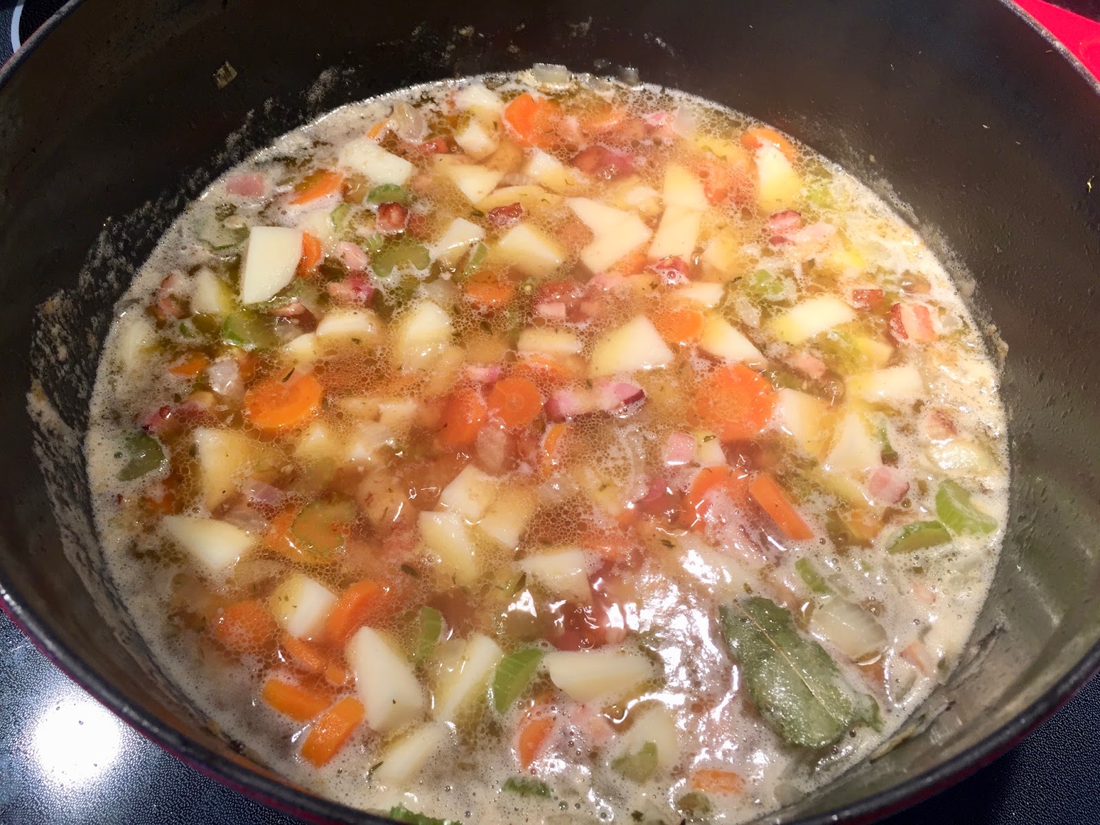 Raise the heat to medium high and bring to a simmer, then lower the heat back to medium and simmer for 8-10 minutes or until the potatoes are halfway cooked.