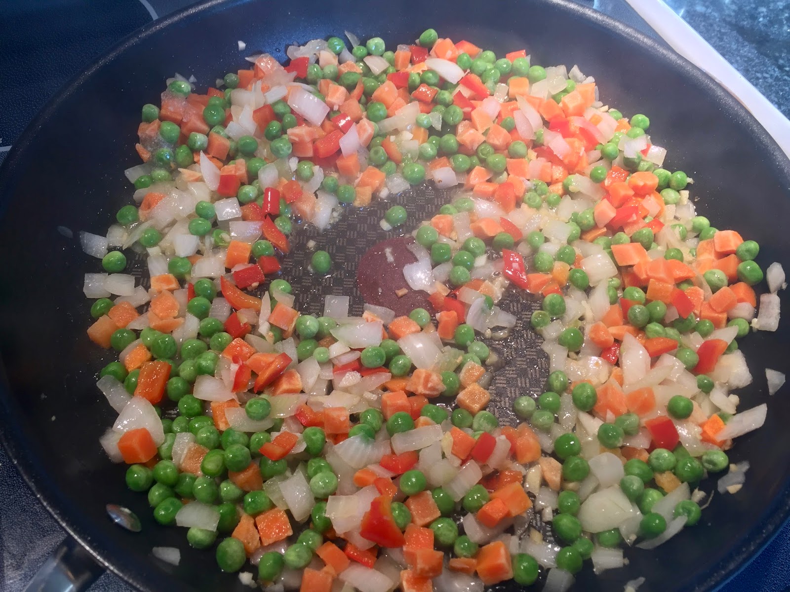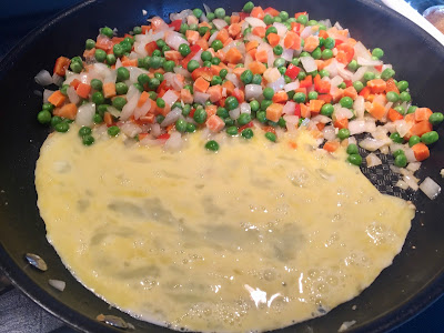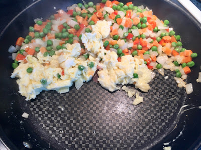 Slide veggie mixture to one side of the wok and add in the beaten eggs, scrambling until cooked through and then incorporate with the veggies.