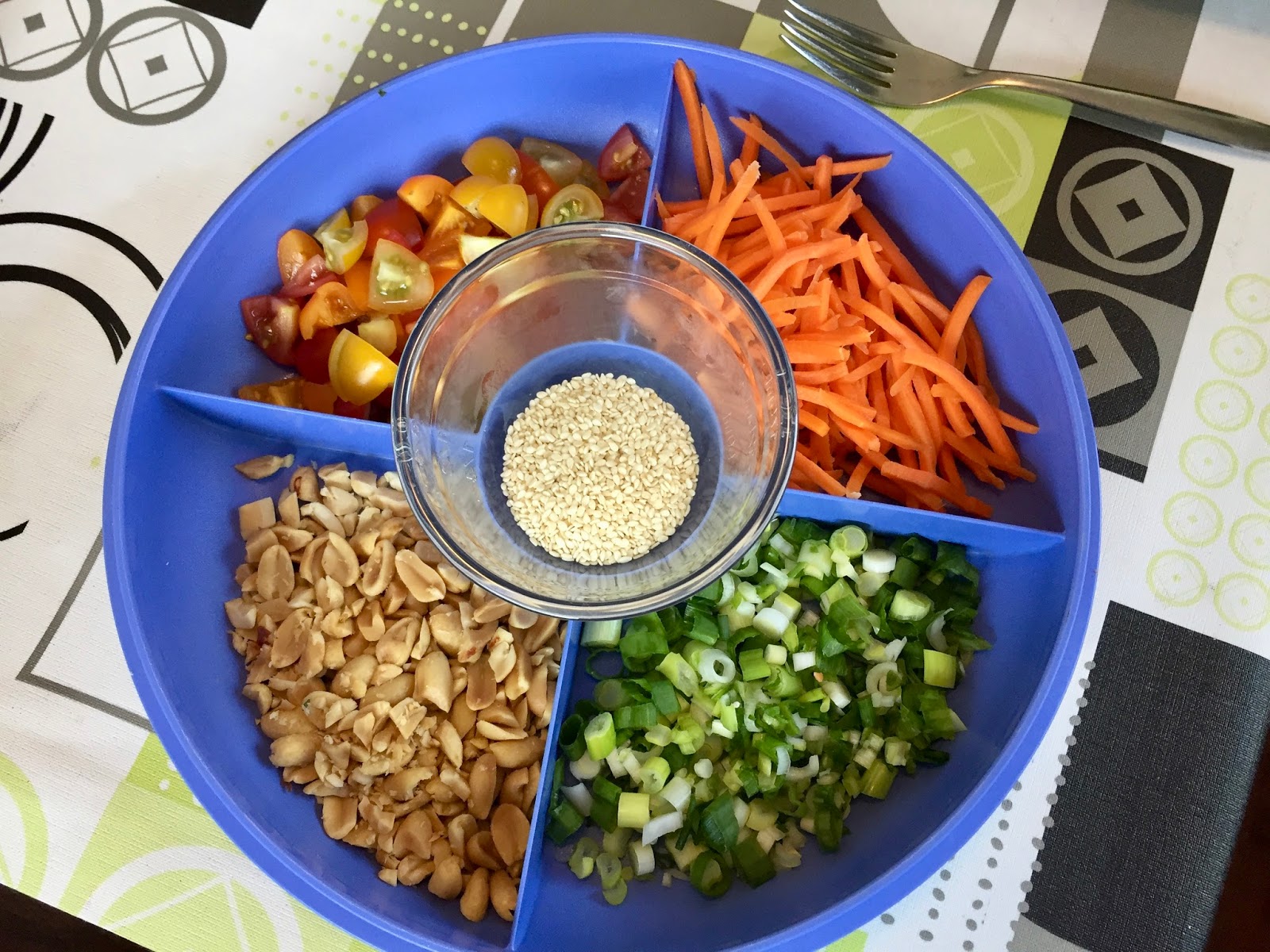 To serve, place the meat mixture in the lettuce cups and top with shredded carrots, tomatoes, peanuts, sesame seeds, and green onion.