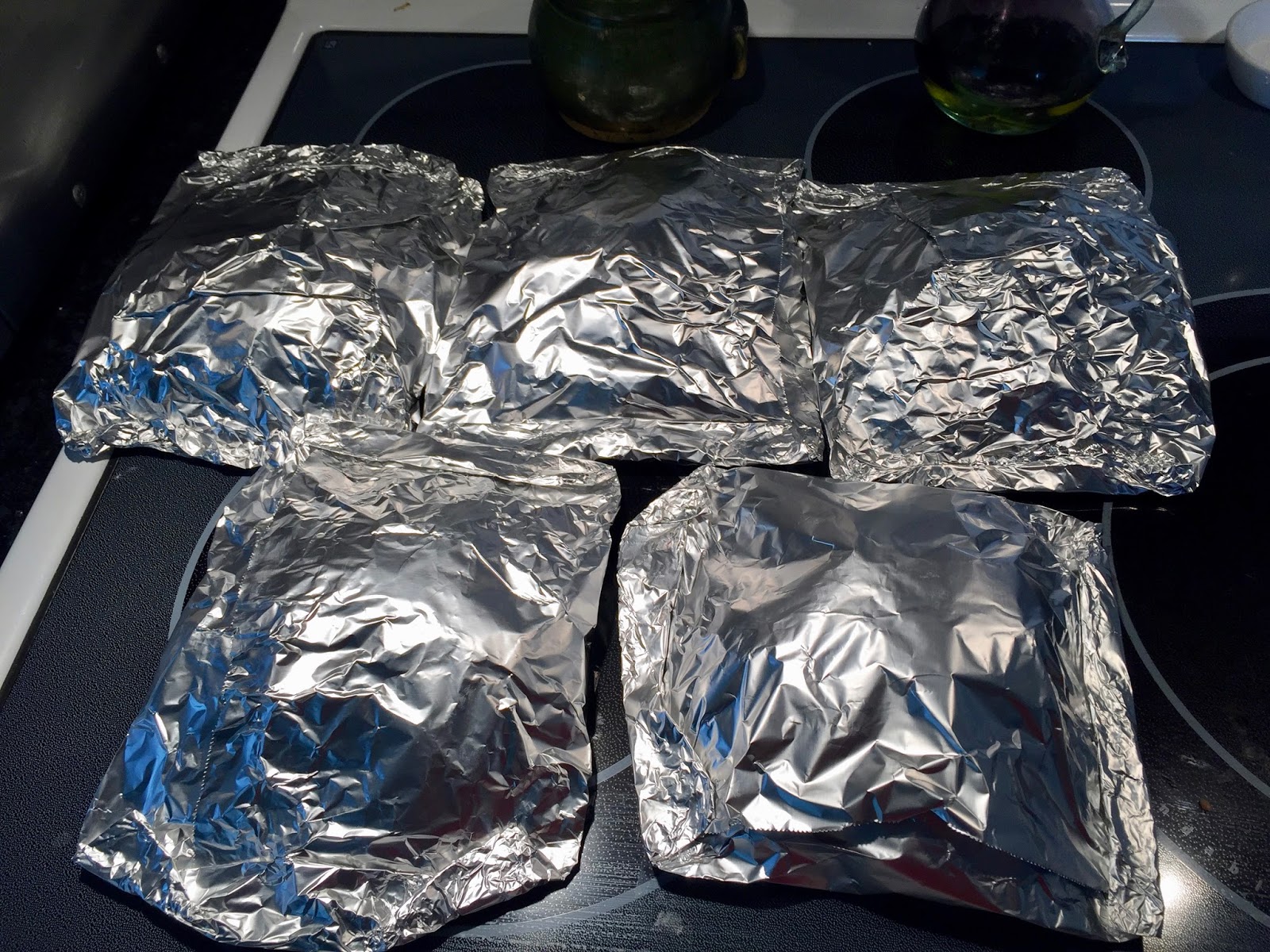 Lay 4 pieces of foil out on a flat surface and spray with cooking spray. Preheat grill to medium-high heat.