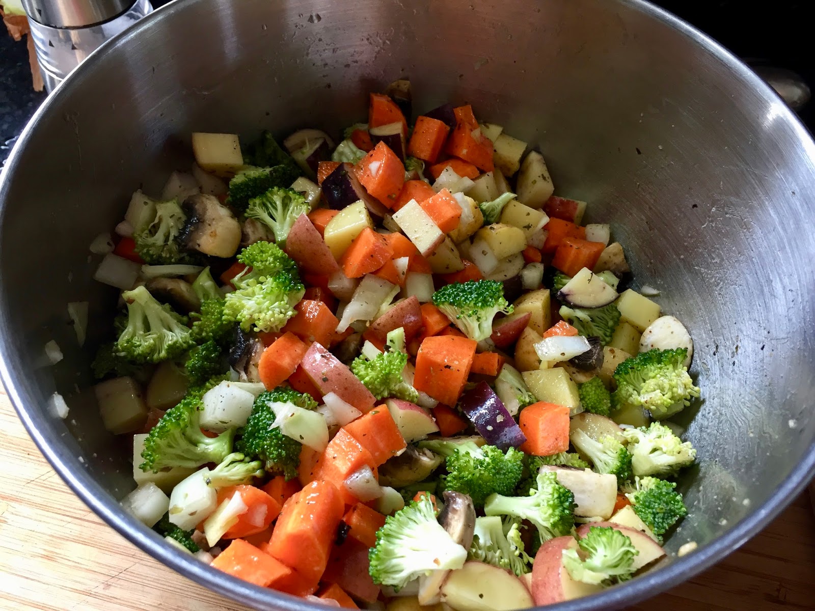 In a medium bowl, combine broccoli, carrots, potatoes, onions, oil, and Italian seasoning and season with salt and pepper.