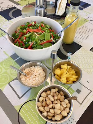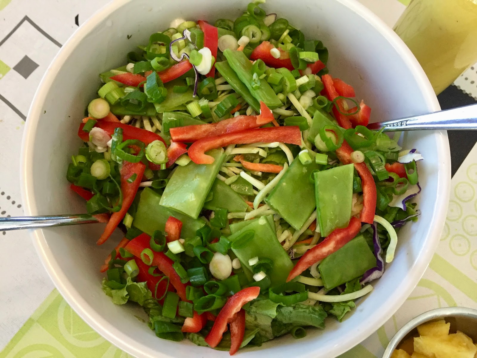 Salad: Toss lettuce, slaw, peppers, peas and green onions. Top with coconut, nuts and diced pineapple. Drizzle with dressing.