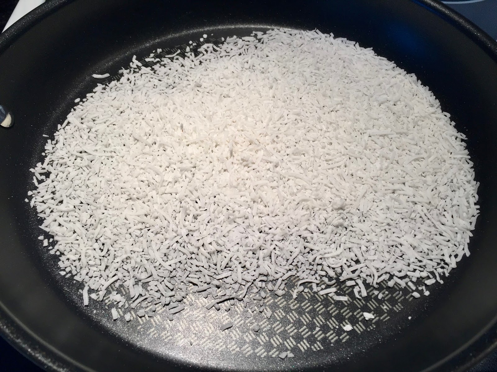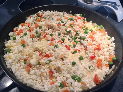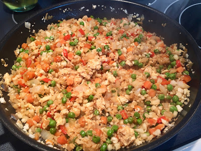 Stir in cauliflower “rice” and pour the soy sauce over top, mixing well.