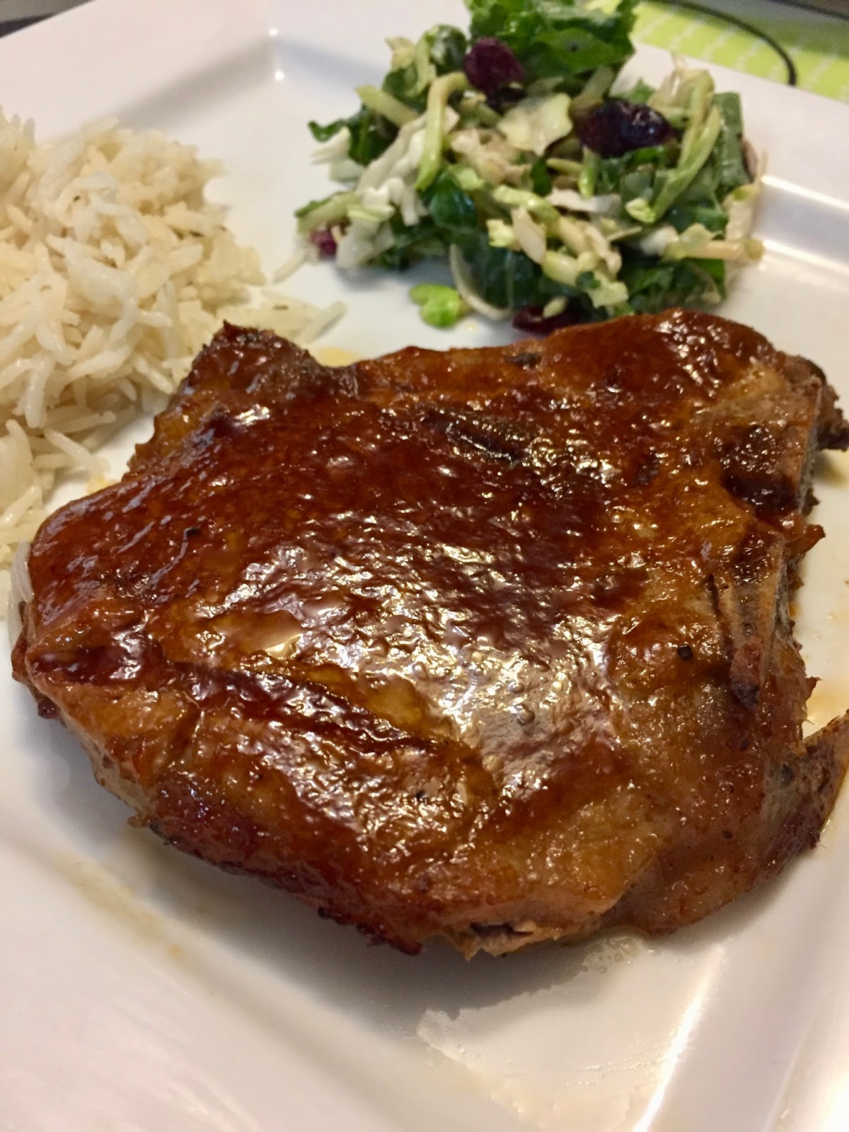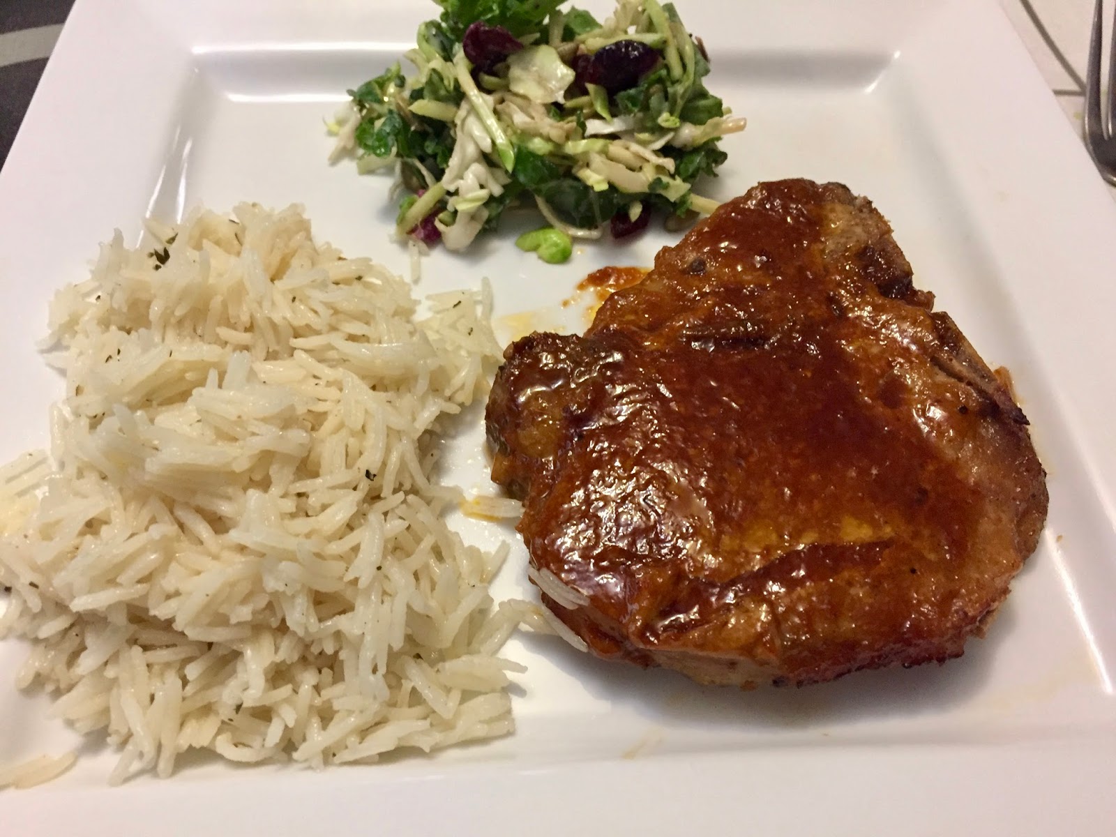 Serving size: 1 pork chop, 1/2 cup rice, 1 cup kale salad Calories: 516