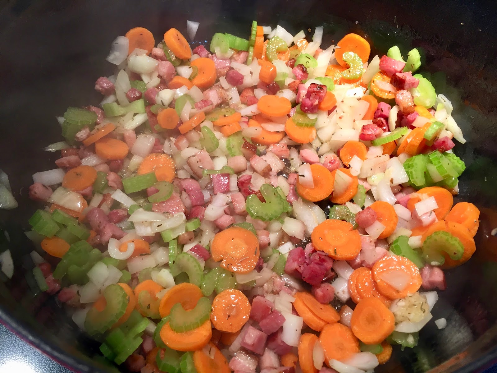 In a large heavy-duty bottom dutch oven, melt margarine over medium heat. Add bacon and cook until bacon renders its fat and begins to brown, about 3-4 minutes.