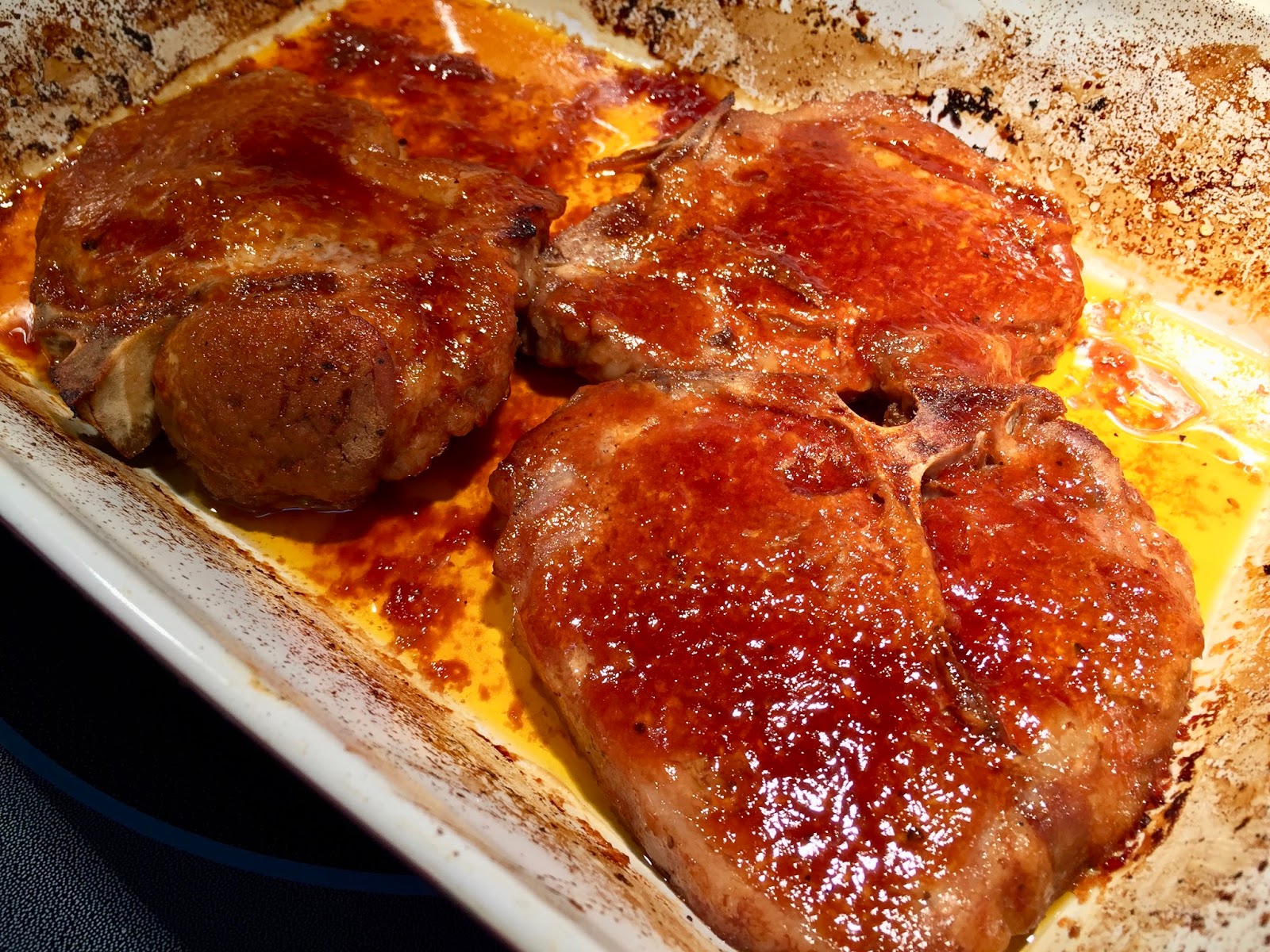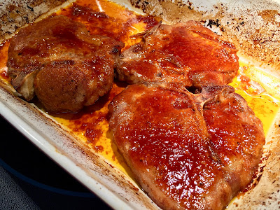 Place your pork chops in a baking dish, pour 1/2 the sauce over the pork chops, cover with foil, bake for 30 minutes.