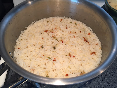 Stir in chili powder, cumin, diced tomatoes, 2/3 cup of the enchilada sauce. Let simmer 2-3 minutes, remove from heat and stir in cooked rice.