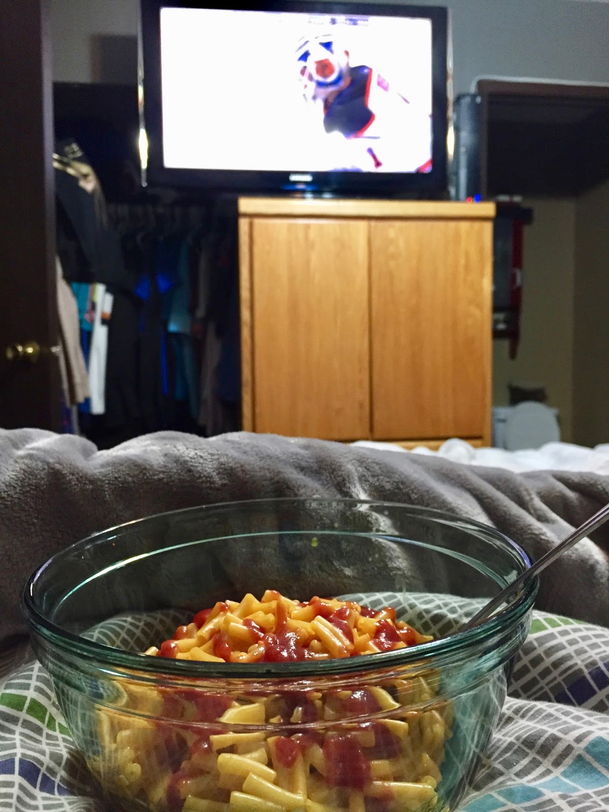 At 9pm it was my turn for dinner and the hockey game 😜. Gross! By the time I got to my Kraft Dinner, it was so cold I could pick the whole thing up with 1 stab of my fork. Even coating it in ketchup didn’t make it better lol.