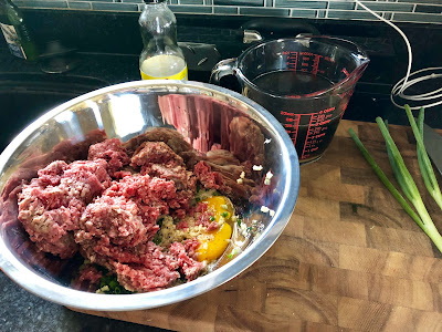 Combine ground beef, panko bread crumbs, about half green onions, egg, garlic, and 1 teaspoon sesame oil. Season with salt and pepper, then mix until combined.