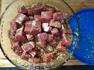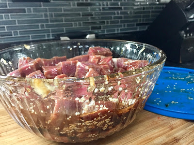 In a large bowl whisk together soy sauce, garlic, sesame oil, vegetable oil, sugar, ginger and sesame seeds. Add the steak and toss to coat in marinade. Marinate for 3 hours or overnight.