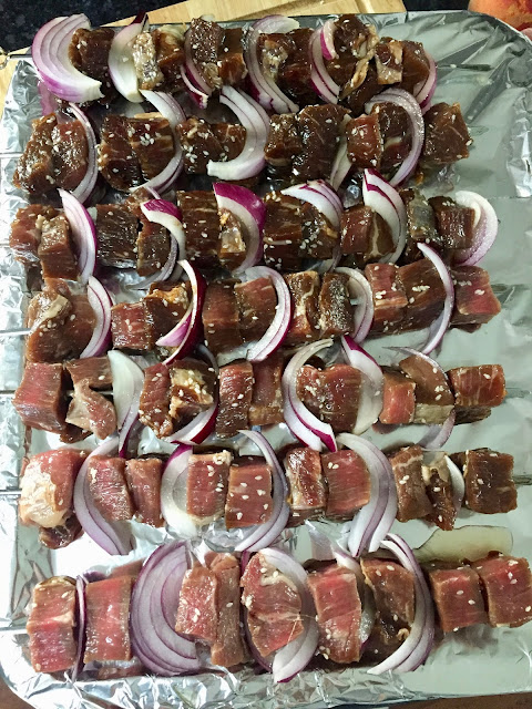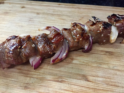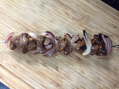 Preheat the grill to medium high heat. Thread the meat and the red onion onto the skewers. Grill for 8-10 minutes until the meat is done to desired liking.