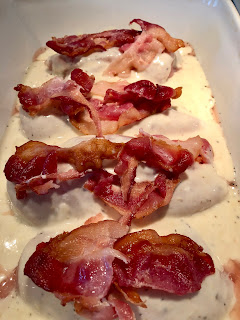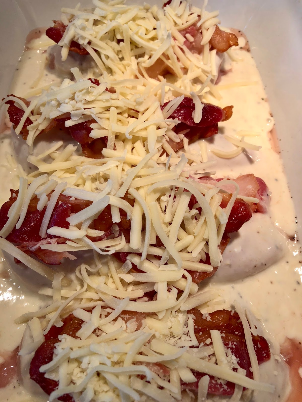 Top of each piece of chicken with bacon. Sprinkle the grated cheese evenly over all pieces.