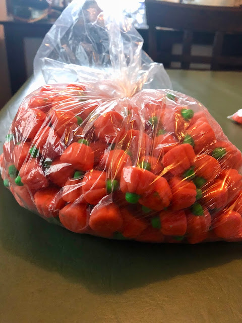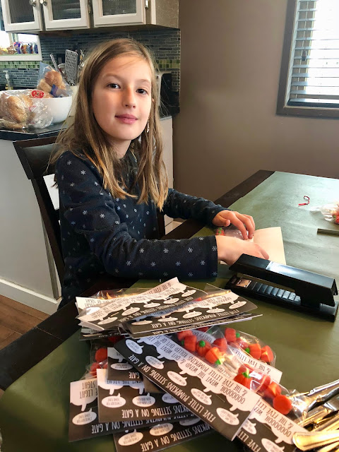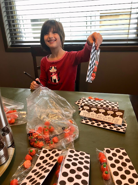 It is hard to find a craft/treat for 50 kids and keep it in budget. Then I saw that Balancing Home had the cutest little printable so I printed up 50 of them from HERE. We went to the Bulk Barn and picked up 250 little pumpkin candies, 50 snack bags and got to work! This was super easy and we think both classes will enjoy them!