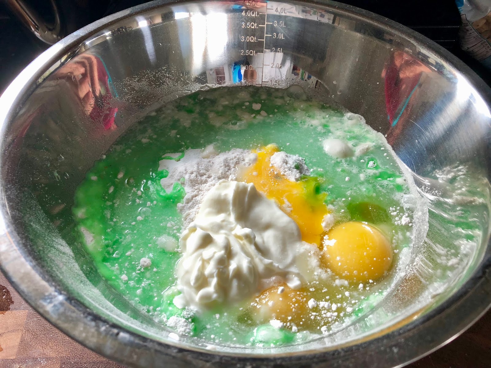 Add the water, sour cream, and eggs. Using a hand mixer, stir all ingredients for one minute on high speed.