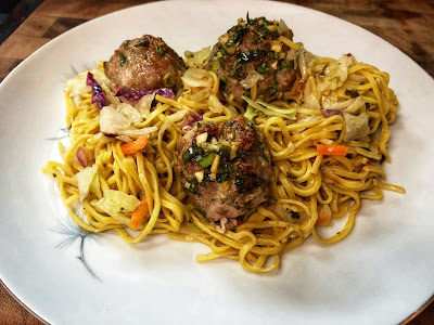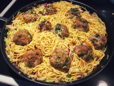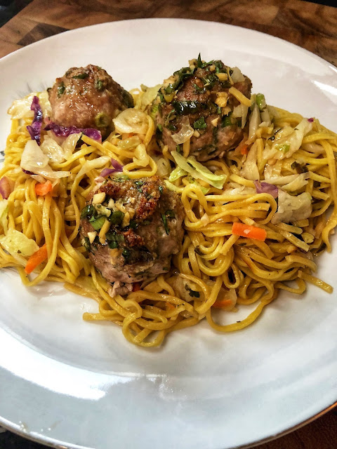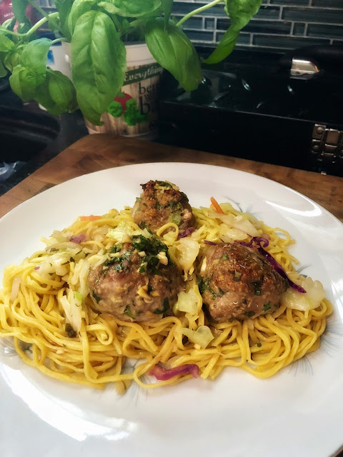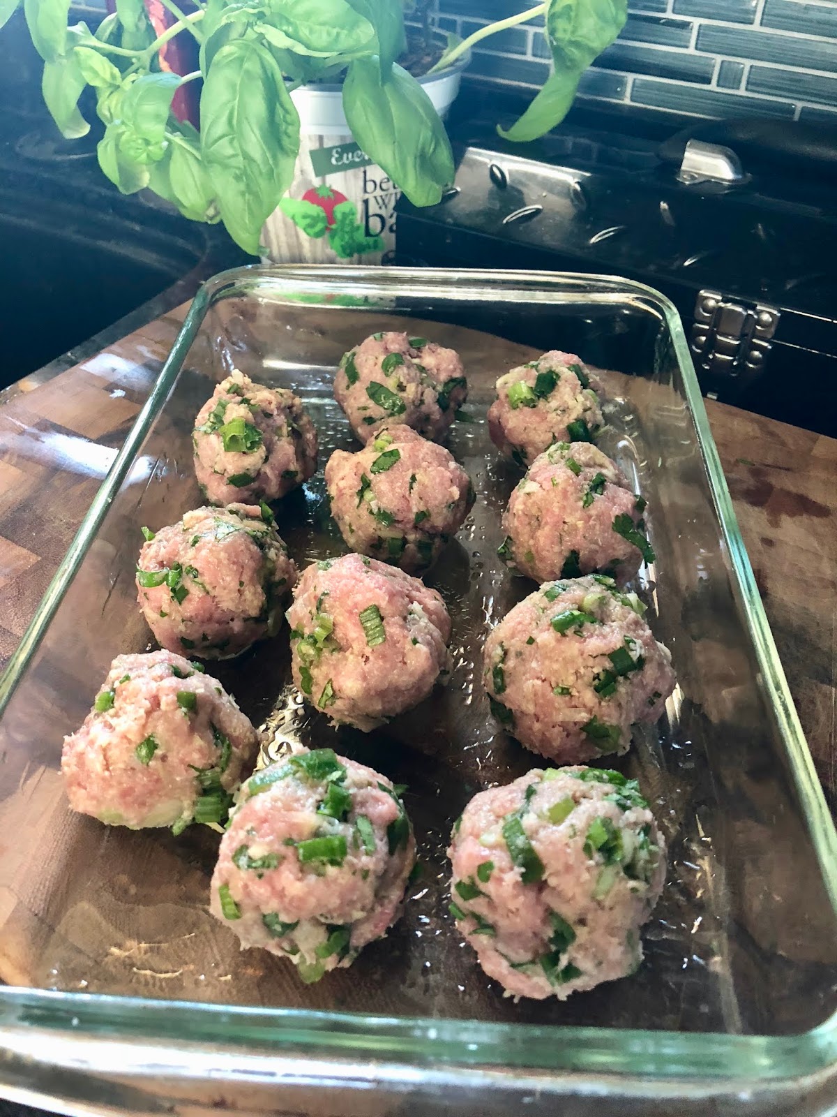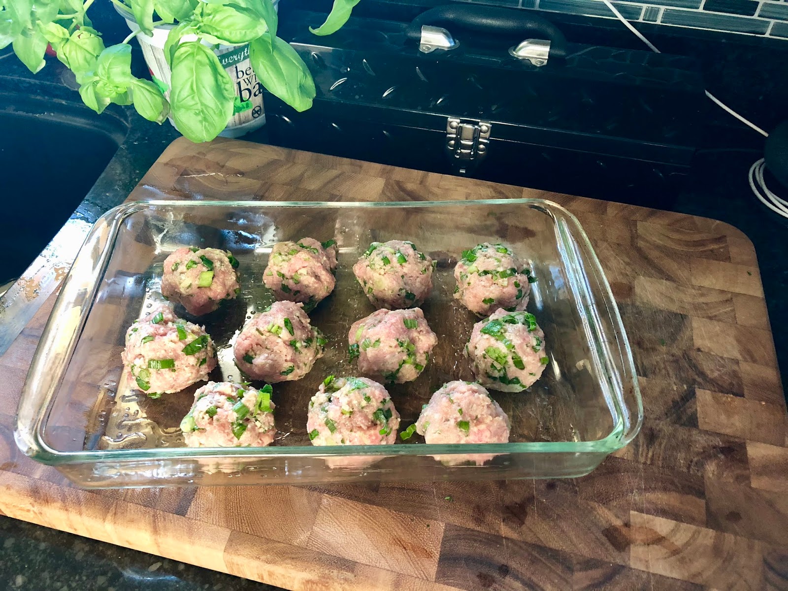 Combine all the ingredients for the meatballs thoroughly and roll into tablespoon sized balls with wet hands.