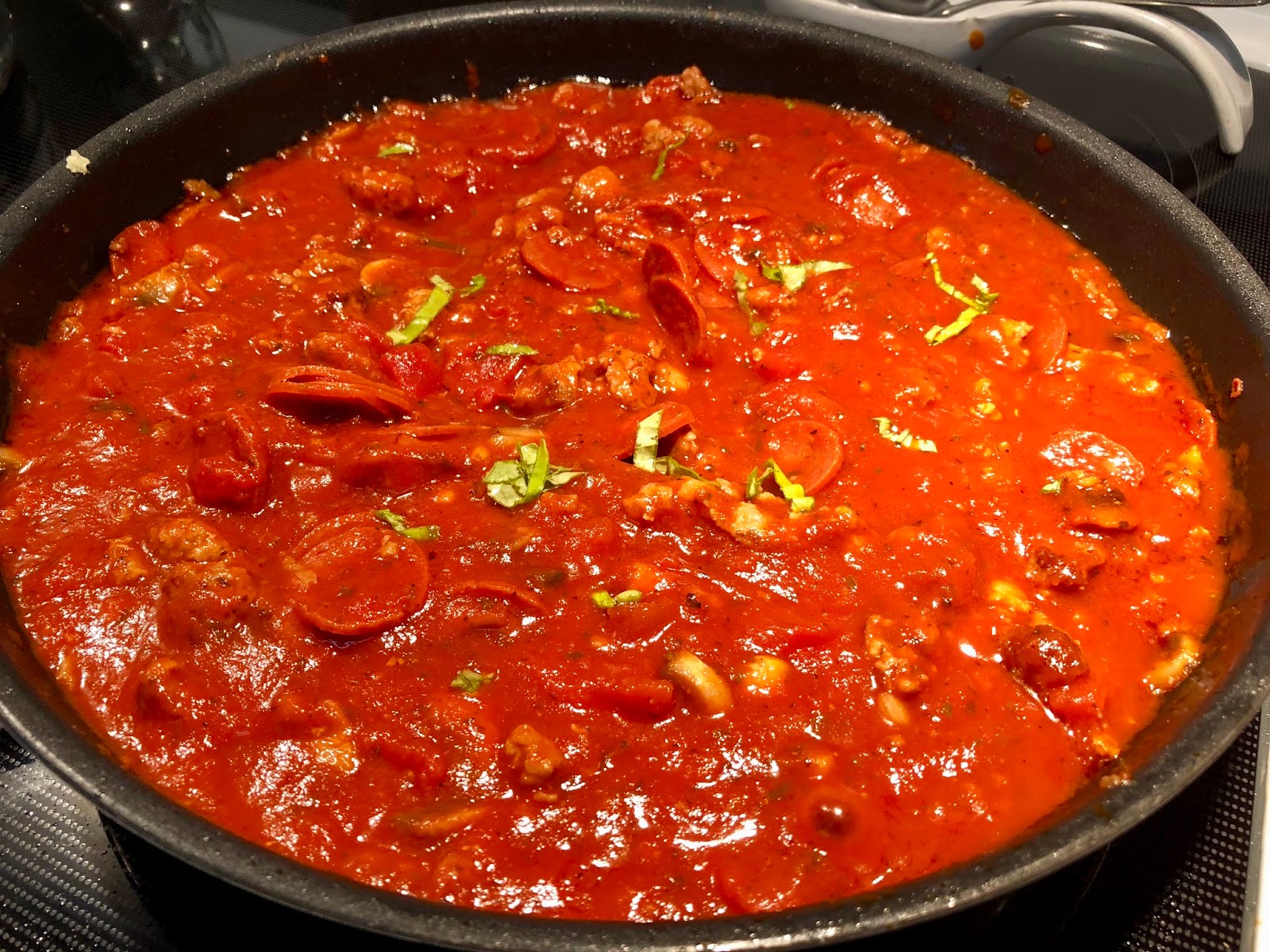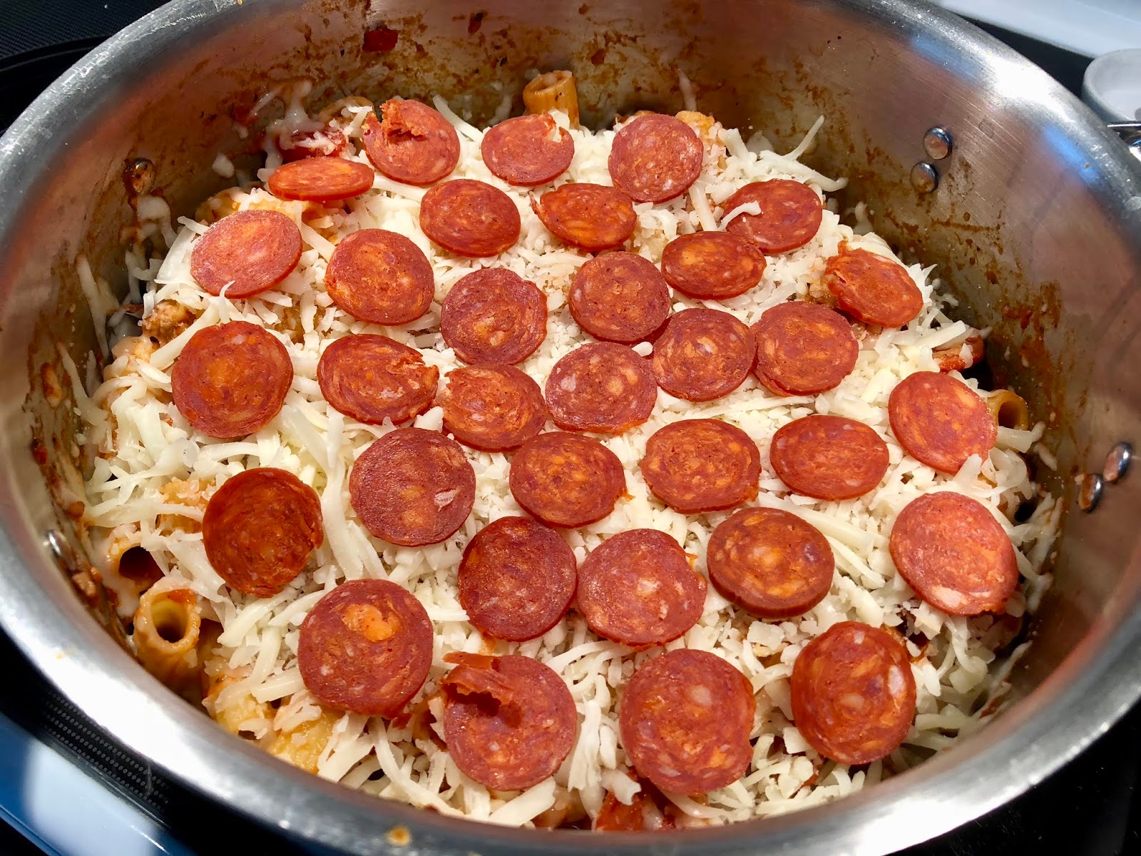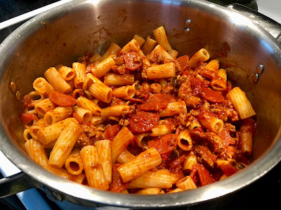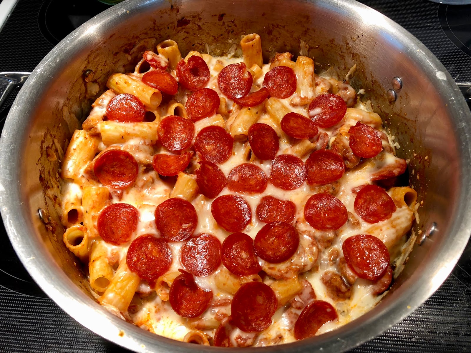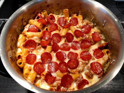 To the pot of drained pasta add the browned sausage, pasta sauce, half the pepperoni, and a 1/2 cup of cheese and stir.