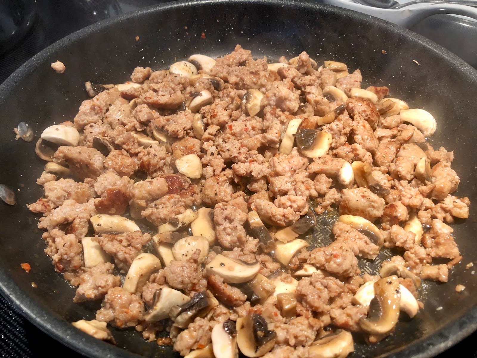 Next add minced garlic and mushrooms and saute for an additional minute; set aside until pasta is done.