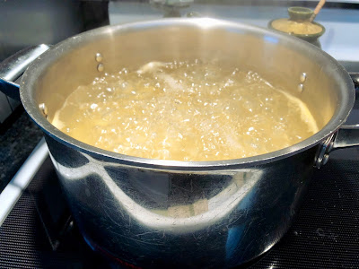 While sausage is browning, bring a pot of water to a boil and cook the pasta according to directions. Drain pasta and put back into the large pot.