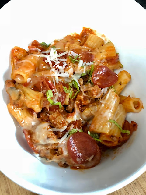 I love pasta! We have pasta once a week but I have a hard time keeping it fresh and new. The Girls like white sauce and Ninja likes red sauce. It can be tricky so I found something that made everyone happy! I made everyone happy by making a  pasta like everyone’s favourite, pepperoni and mushroom pizza! This pasta recipe was a hit! It was ooey gooey pizza pasta deliciousness!