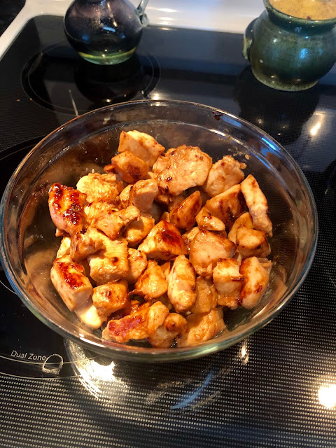 Add 1 tablespoon of sesame oil to pot. Cook chicken until not pink anymore. Empty into bowl and set aside.