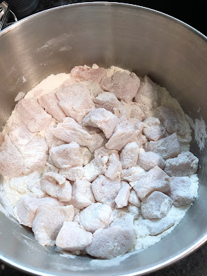 Place the bite-sized pieces of chicken in a large bowl. Add flour and stir to coat each piece. Set aside.