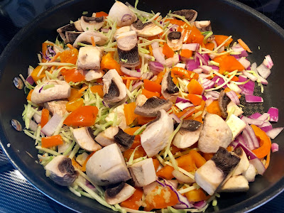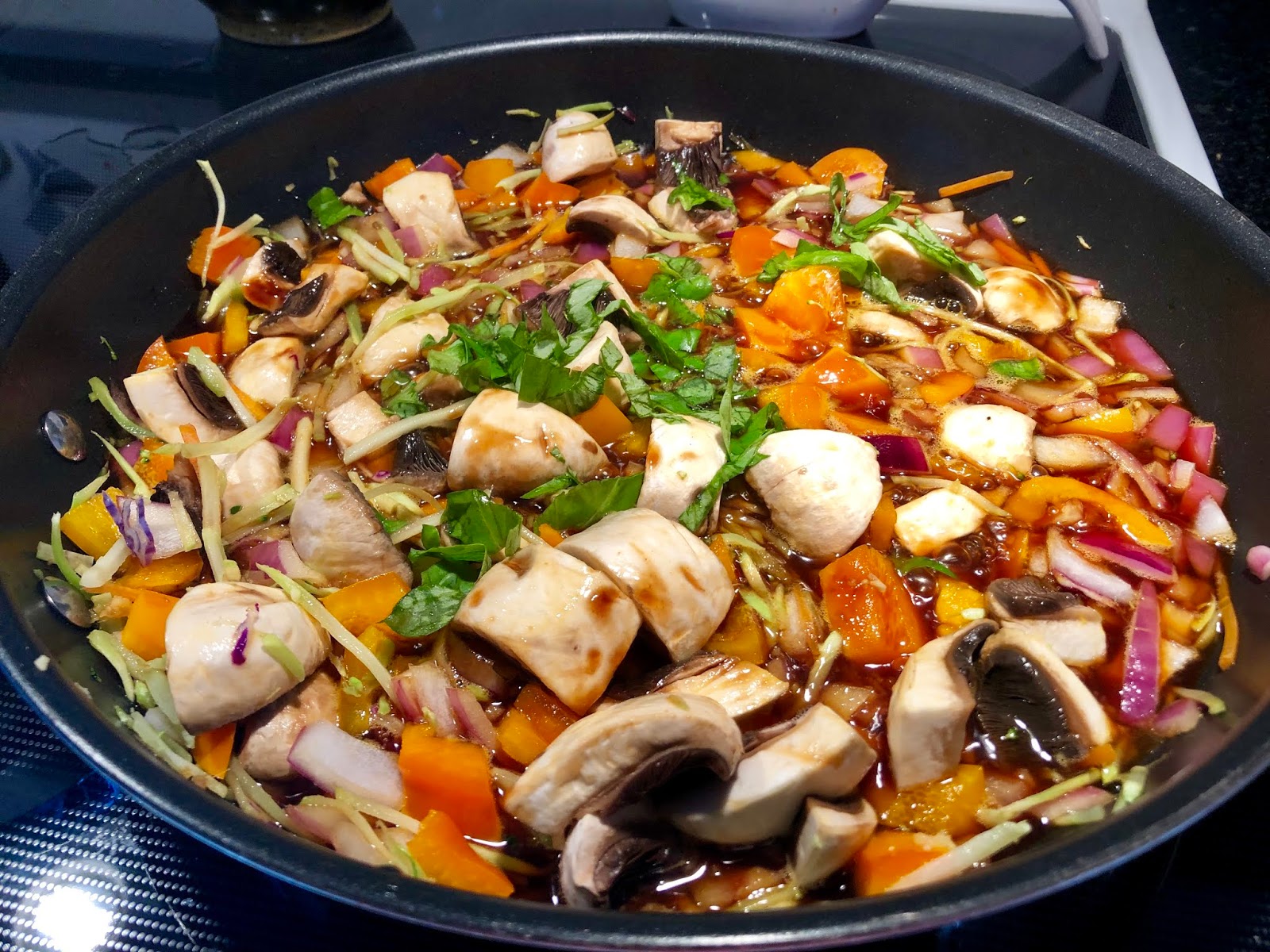 Heat a large skillet over medium high heat. Add the bell peppers, mushrooms, red onion, ginger, and hot pepper (I had a bit or broccoli slaw leftover in the fridge so I threw it in too) cook another 2-3 minutes. Slowly pour in the soy sauce mixture and basil. Bring the mixture to a simmer and cook until the sauce coats the veggies, about 3-5 minutes.