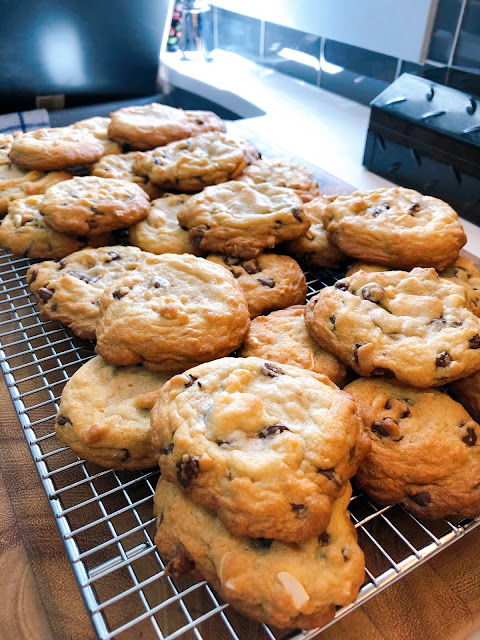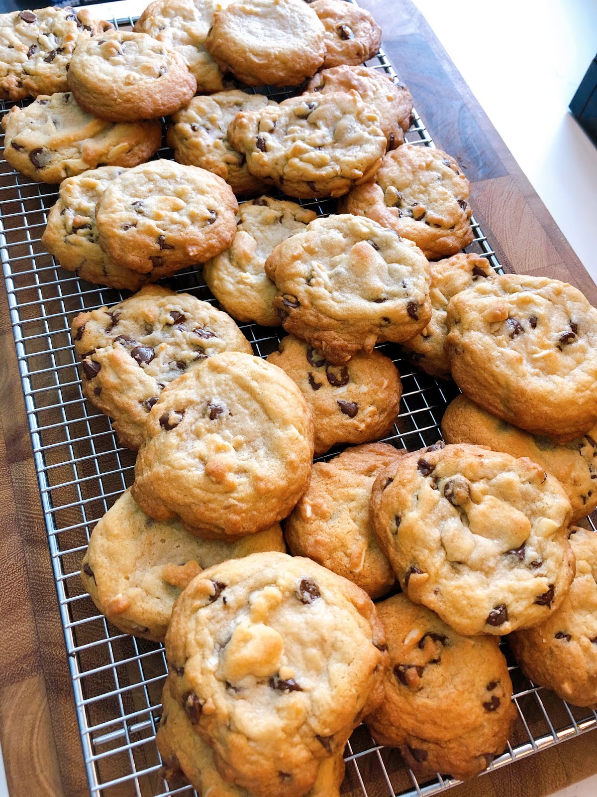 SBean’s teacher sends us a grid of activities to do every week. This week she asked SBean to use the recipe she attached and bake some cookies! I wasn’t too excited because I am very picky about my chocolate chip cookies and I basically only like my Nana’s recipe. I was shocked at how good these cookies were! My favourite part was the nuts! We used toasted almonds. I usually toast a cup of almonds every week and we use them on salads and stuff, like the Girls usually pilfer them throughout the week for their yogurt or just to snack on. These cookies were chewy, had depth of flavour from the nuts and were full of chocolatey goodness! Thanks Ms. H!