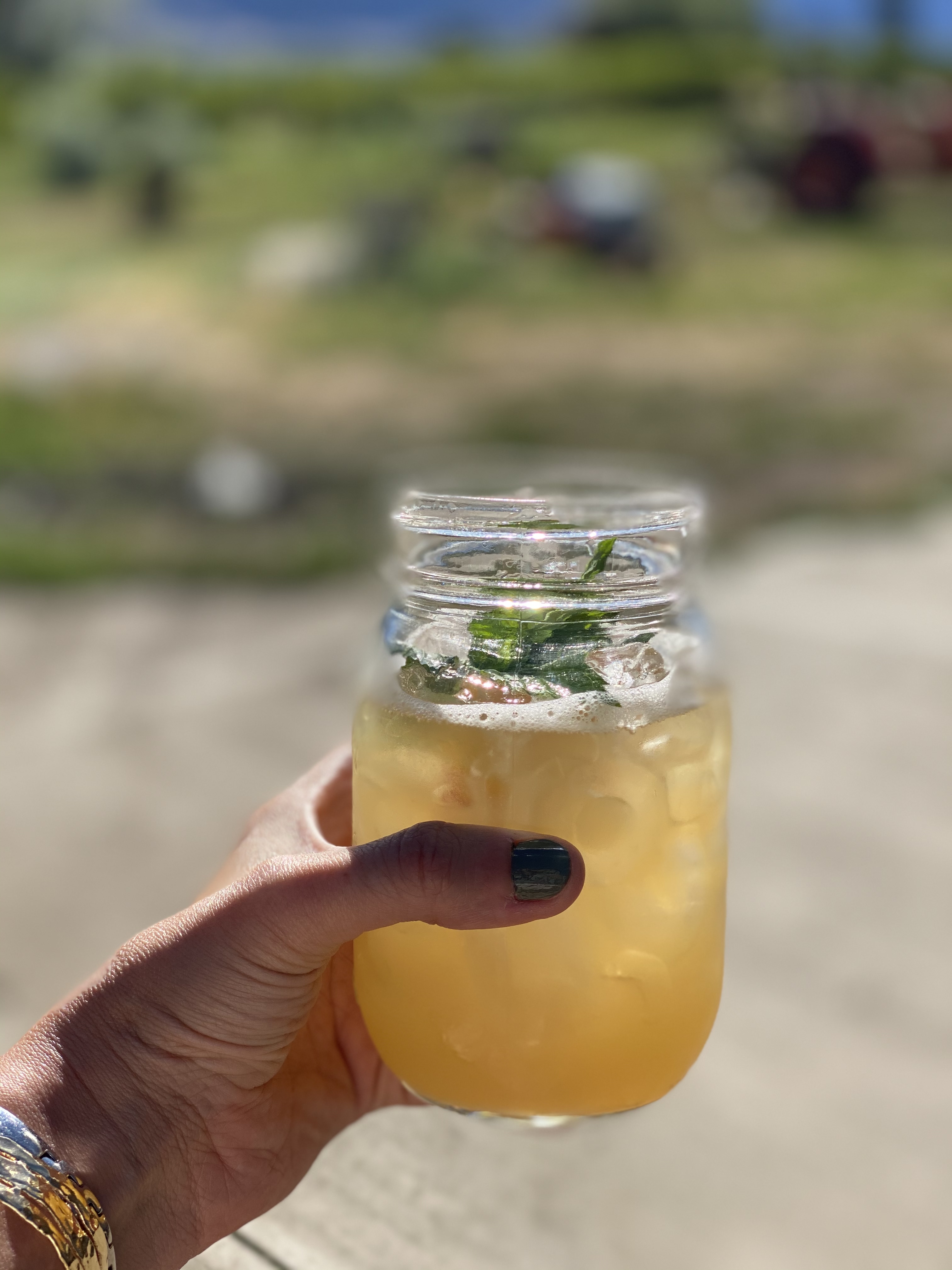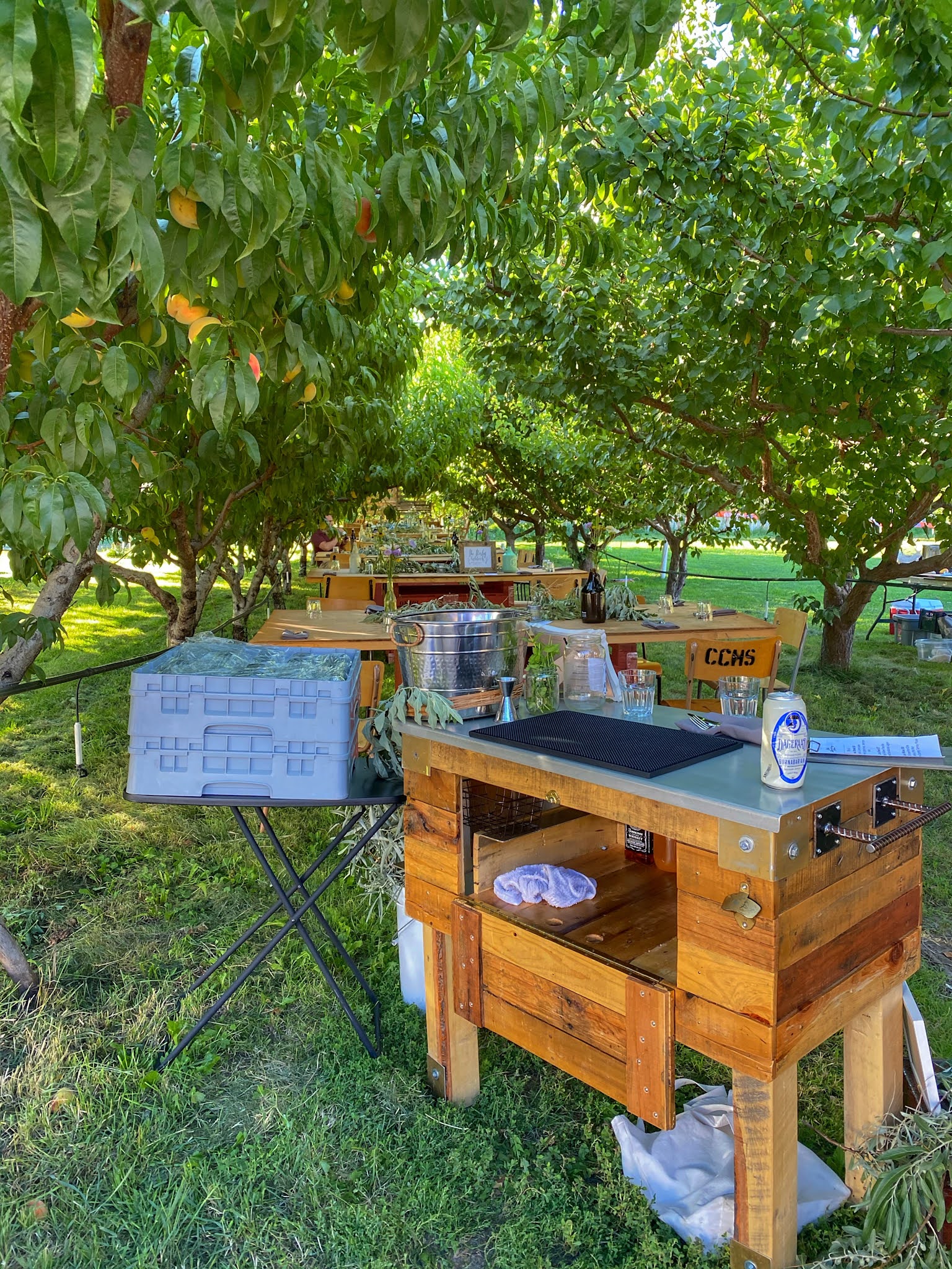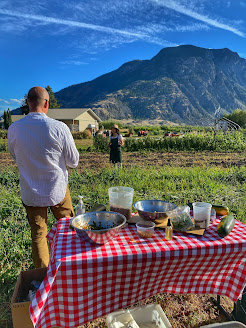 We started at the farm and had a tour with the farmers! The whole idea is to see where your food comes from. We walked through rows and rows of flowers & veggies popping little cherry tomato deliciousness into our mouth’s as we sipped on fresh Peach Bourbon Smashes. Chef Aman joined us in the field and prepared our 1st course. It was an Indian salad with Okanagan ingredients! She puffed Albertan wild rice an added in sautéed BC lentils, did a peach gastric with local honey and apple cider vinegar and then tossed it with amazing fresh vegetables and stuffed it in a cone shaped grape leaf! It may be the best thing I’ve ever tasted in my entire life! For the actual dinner we headed over to the farmer’s homestead where tables made out of giant sheets of recycled plywood and overturned applecarts beautifully decorated between 2 rows of in season Peachtrees! It was like a Pinterest fairytale right in front of my eyes!