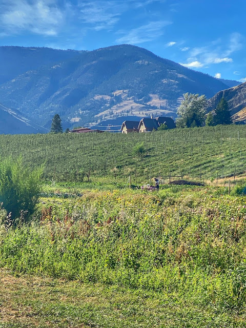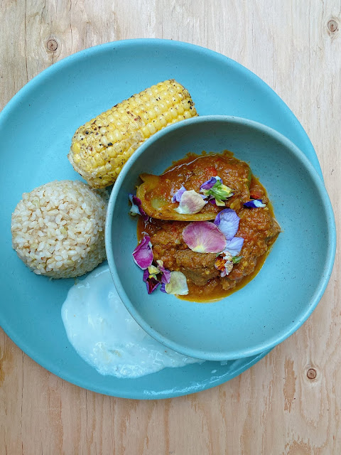 In between each course that the Chef, her Mom, and her Brother (also the bartender) prepared, she shared hilarious stories that were thought-provoking and incredibly personal. It was just a magical experience! Not to mention the food! We had her Mom’s famous pakoras, roasted corn… that she roasted right in front of us on a little Coleman Grill!! With Indian spice blend on it that was a party in my mouth! The smells coming out of the outdoor kitchen were INCREDIBLE!!! That was served with a beef stew (from a local cattle ranch)and BC rice. For dessert she made a spiced yogurt with a peach compote and dehydrated flowers! I wish you had heard her explain these dishes so much better than I ever could!