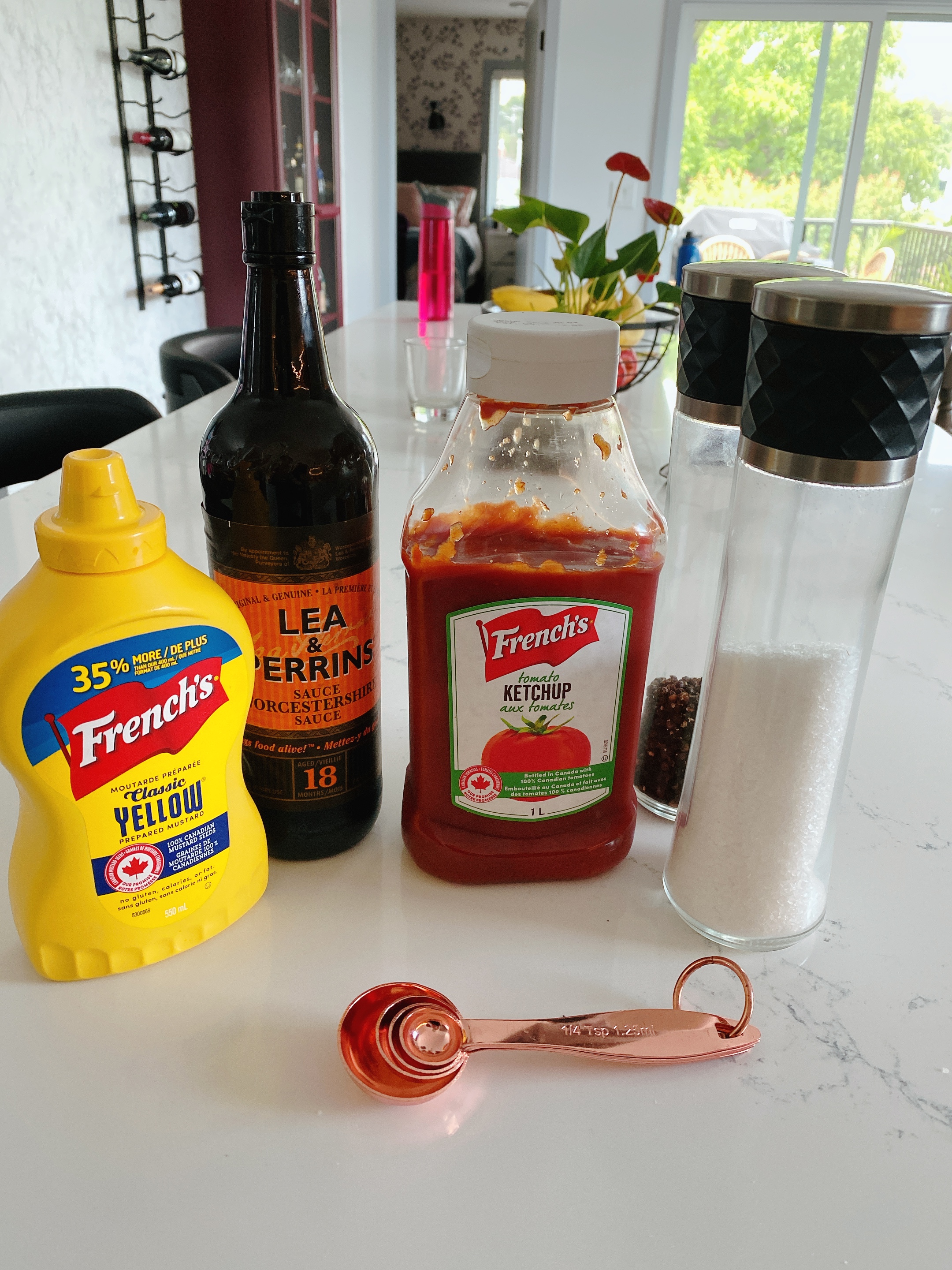 Add ketchup, mustard, onion, Worcestershire sauce, and season with salt and pepper.