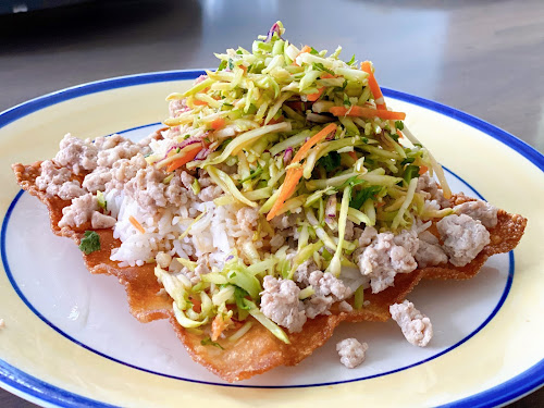 crispy egg roll wrappers with rice and pork. Mound  slaw on pork and sprinkle with a few cilantro leaves. Serve with remaining soy sauce mixture for drizzling.
