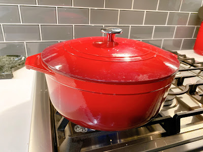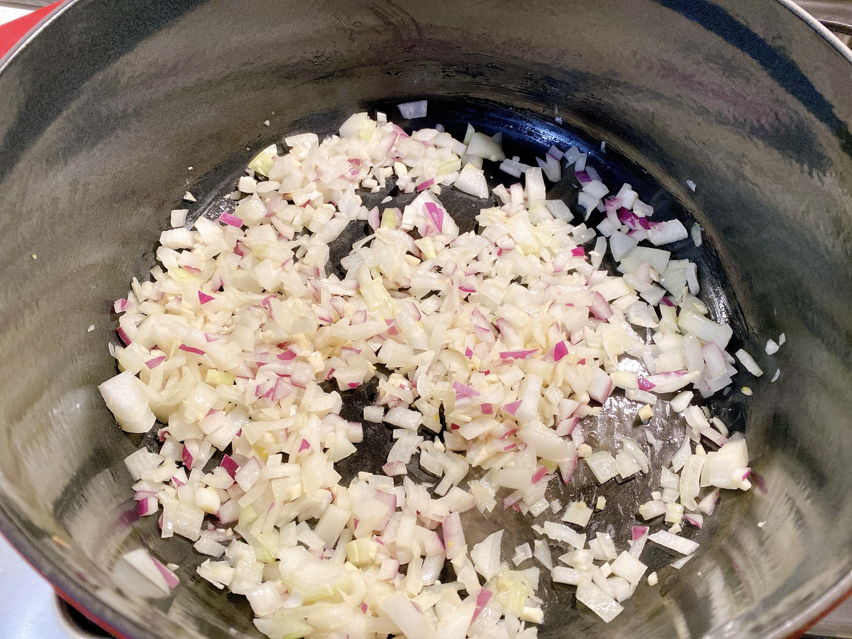 In a large Dutch oven, heat oil until hot. Add onions and garlic.