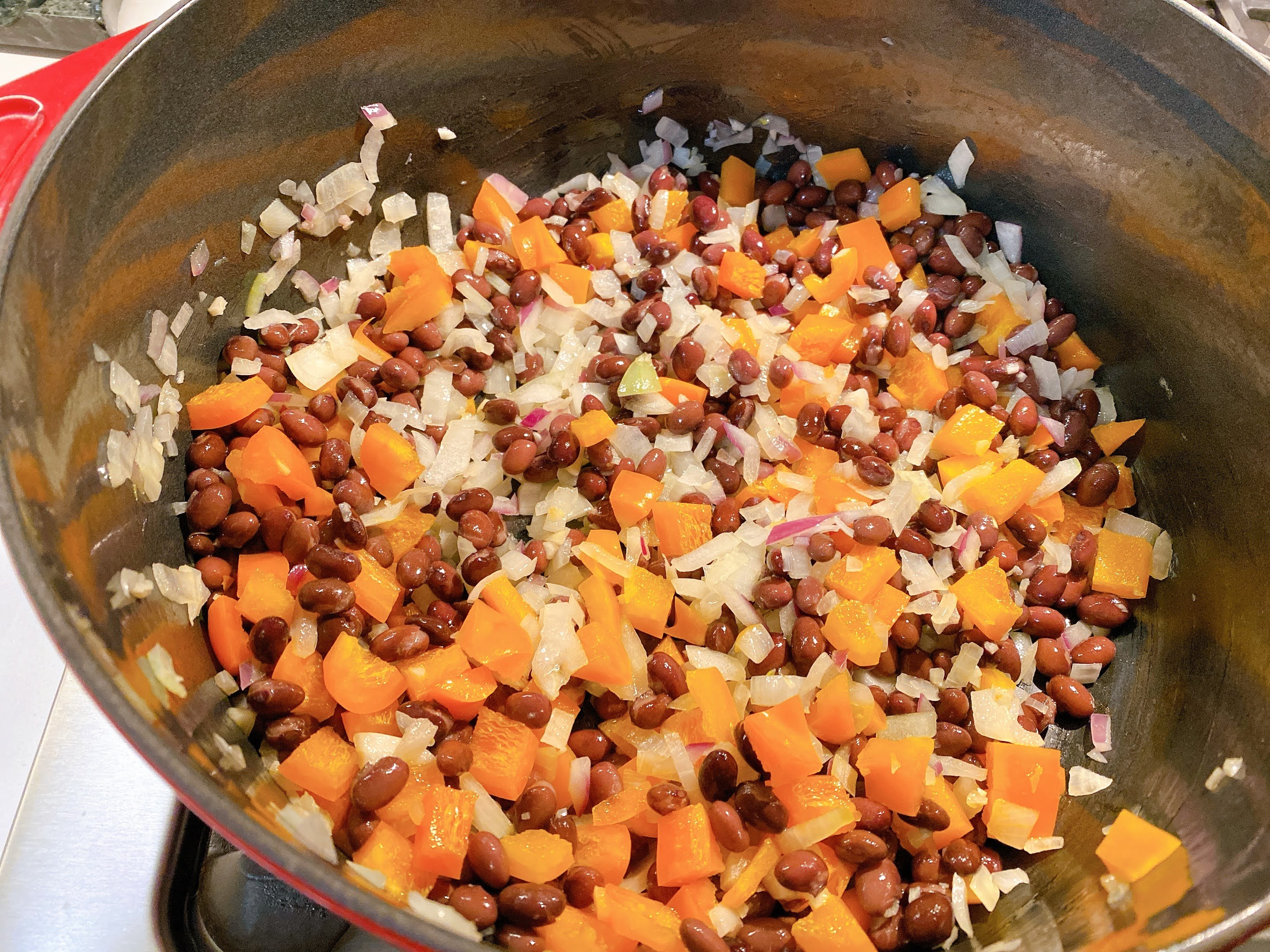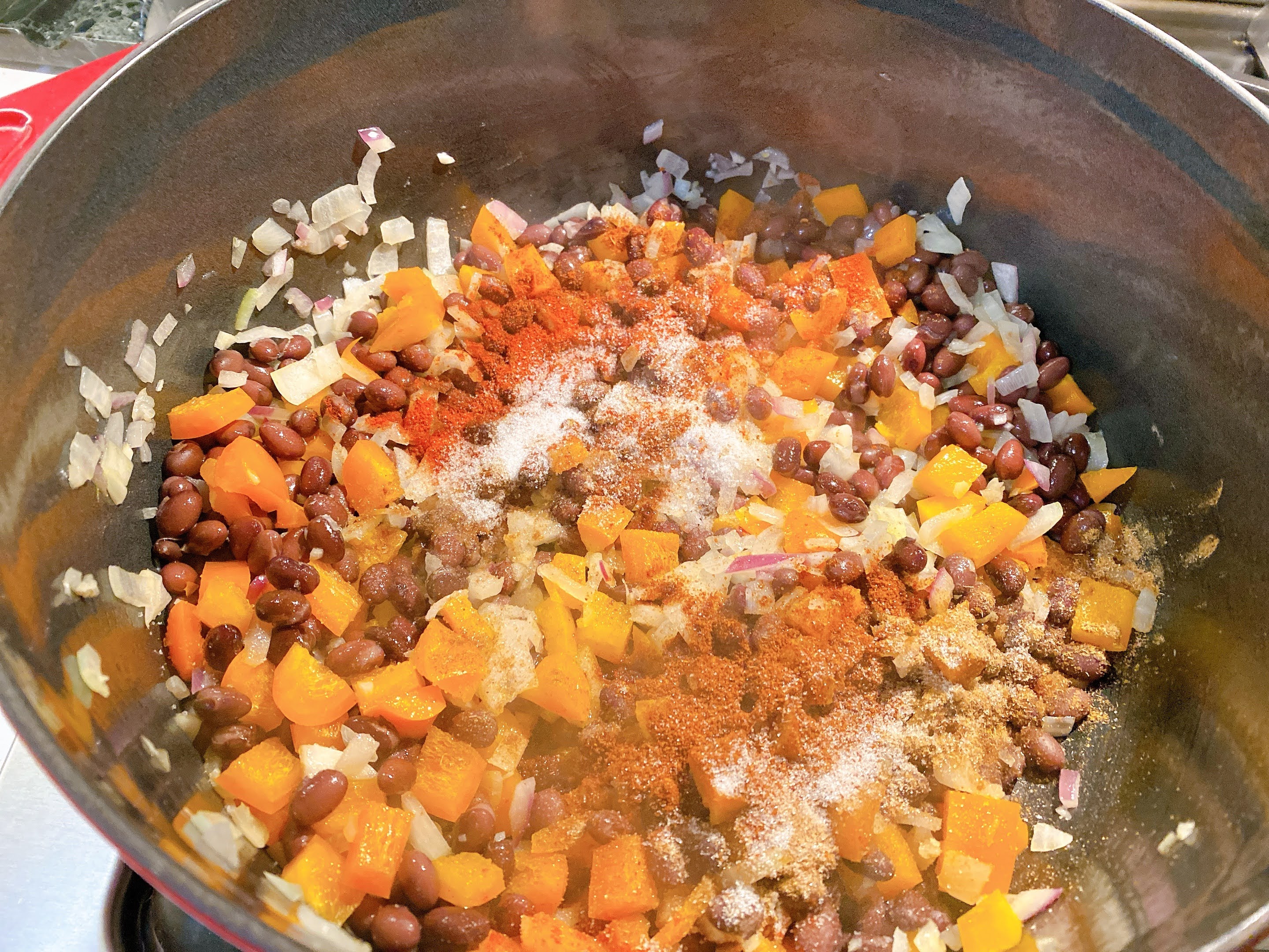 Stir on medium-high heat 3 minutes or until tender. Add bell pepper, black beans, salt, chili powder, sugar, cumin, and paprika; stir 2 minutes on medium-high heat.