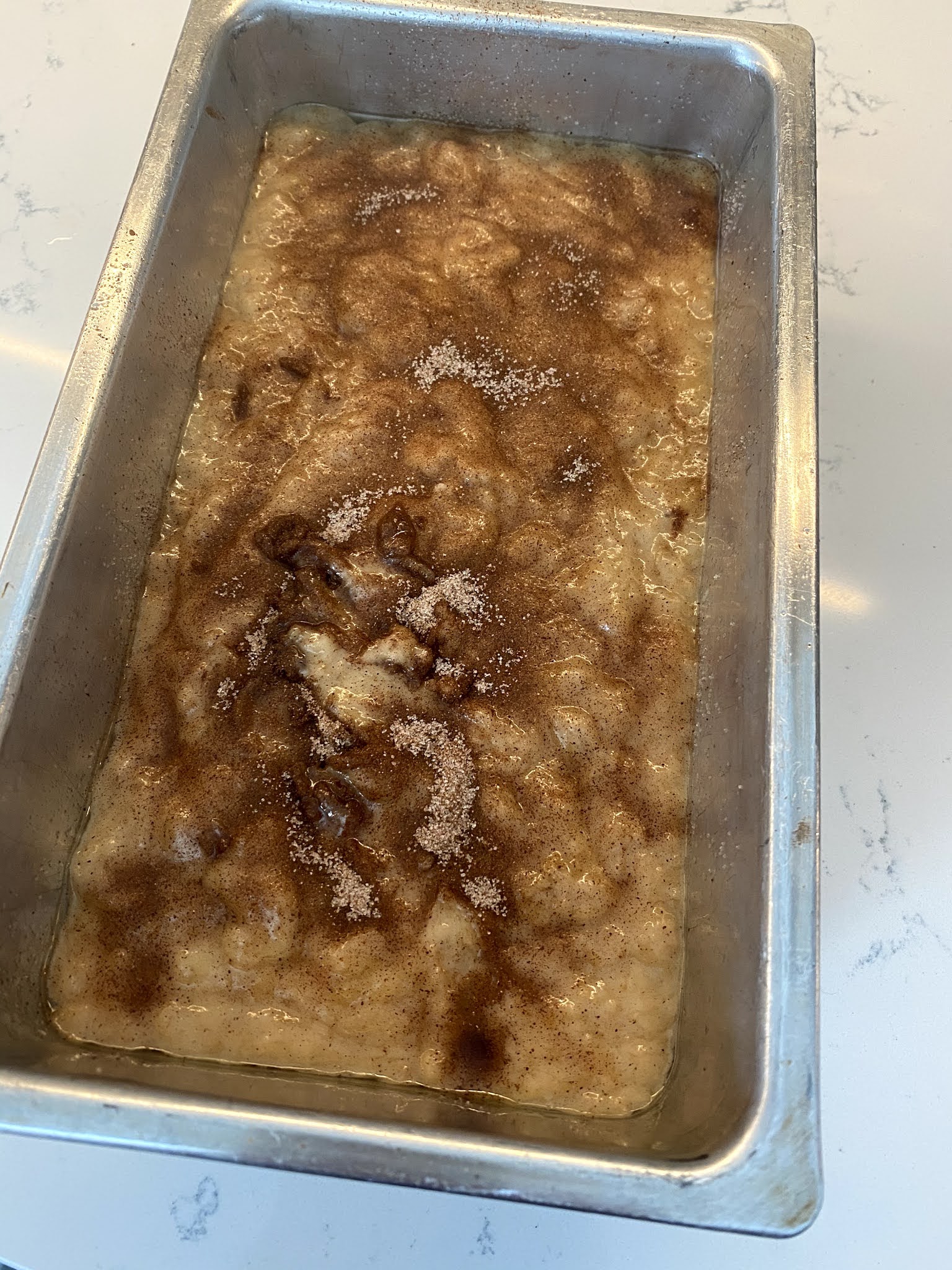 Pour batter into prepared pan. Sprinkle generously with cinnamon/sugar.