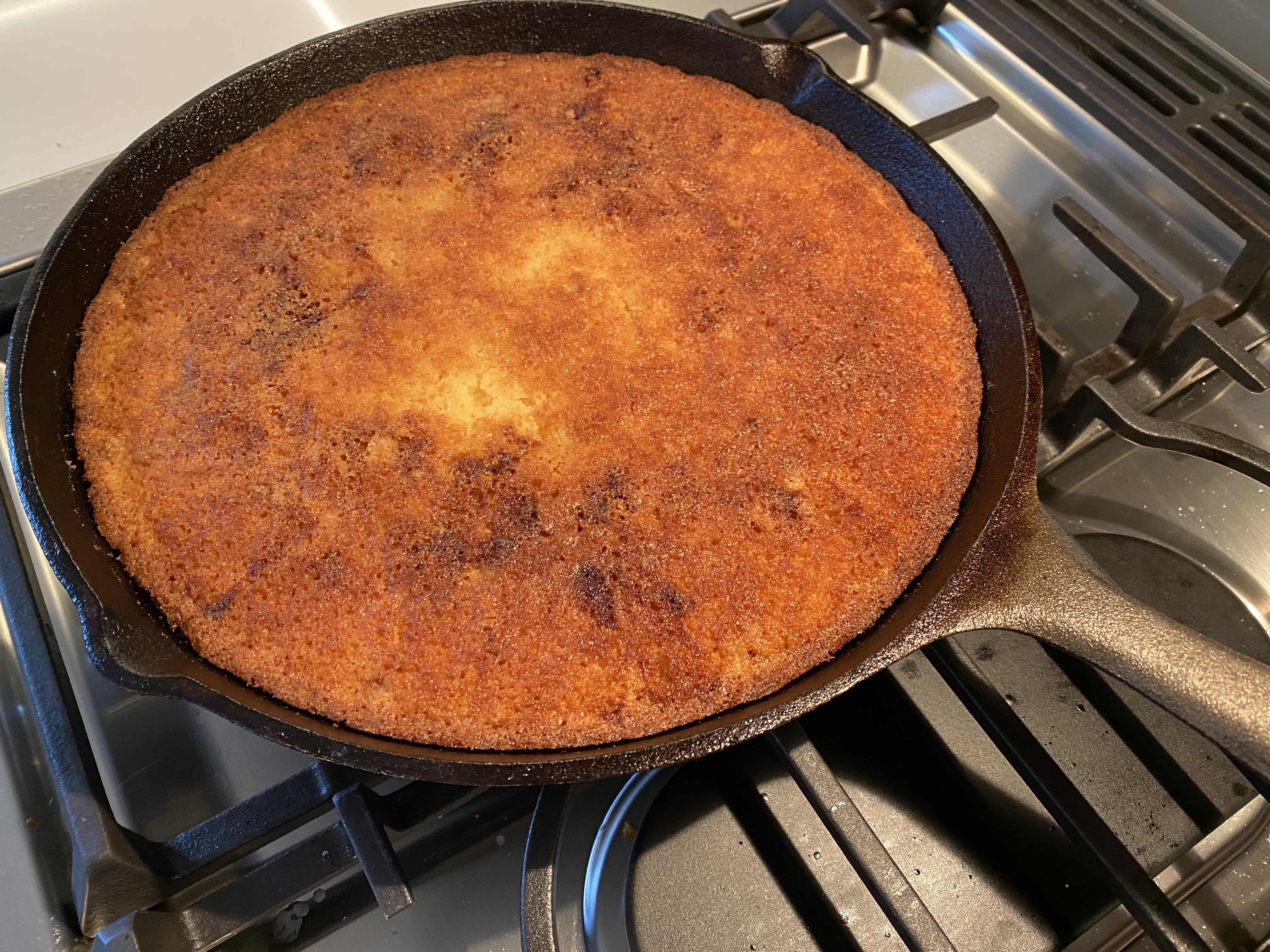 Place the hot skillet back in the oven. Bake at 375 for 28-32 minutes. The cornbread is done when the top is golden brown and the edges pull away from the edges of the pan.