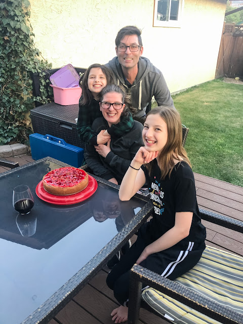 Our week started off great! Selfies and sunshine! The weather has been phenomenal and it  has really been needed! We had some yummy dinners, delicious drinks and I finally got to go to HBear’s school to pick her up for her orthodontist appointment! It was so nice to be there again! I had a PAC meeting and I walked by a house that reminded me that we are all in this together 💛. Ninja brought me home some gorgeous spring birthday flowers and SBean helped Daddy make my very favourite cherry cheesecake 🍒. I went up to have a chat with my Mommies and to enjoy the sunshine and the view and then I went and got a much needed haircut! I feel like 42 is going to be a great year 💛.