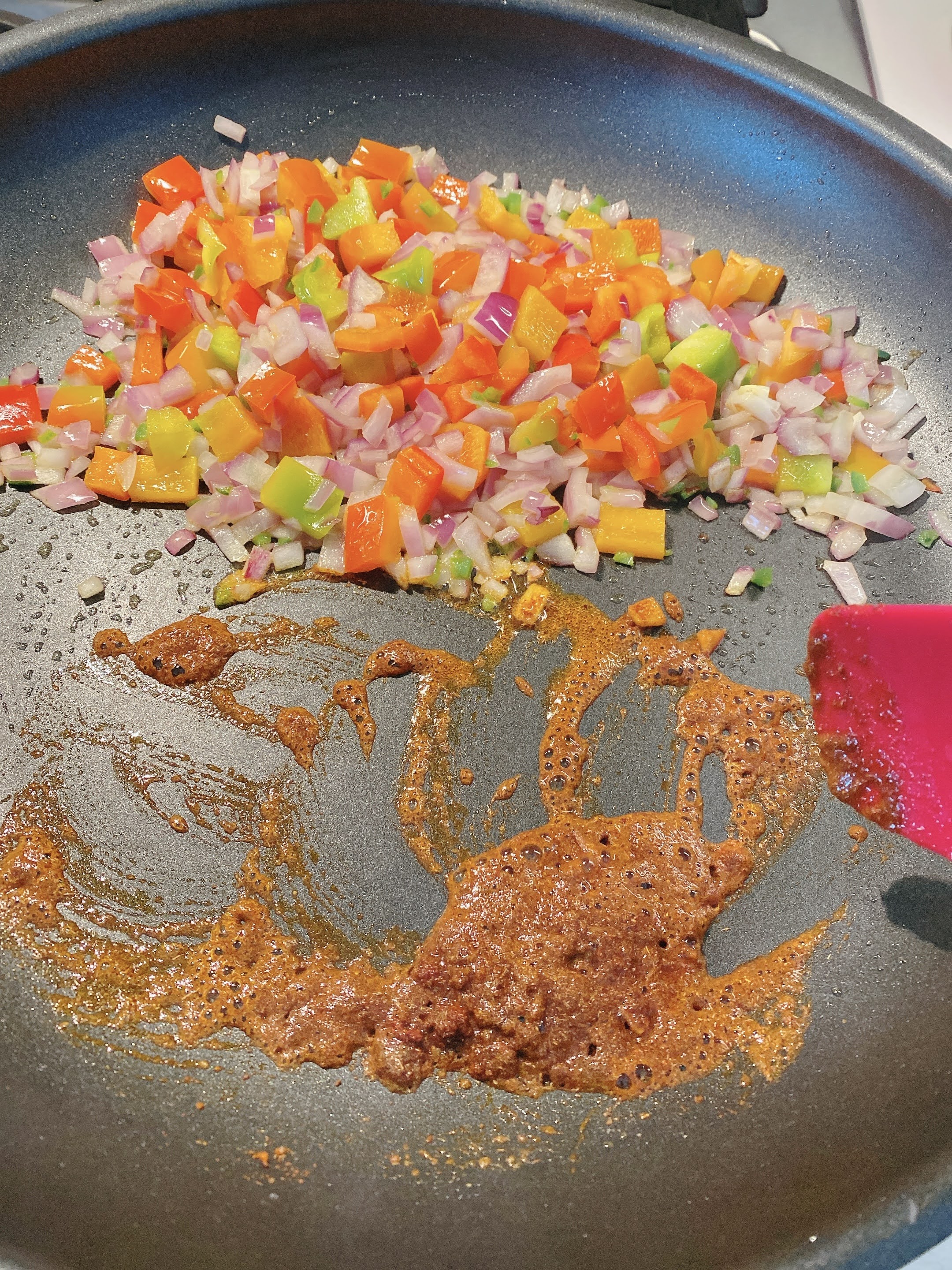Move the vegetables to one side of the pan, and add the remaining olive oil to the cleared side of the pan. Sprinkle the paprika, cumin, chili powder, and salt over the oil, and stir to make a paste. Mix into the vegetables.