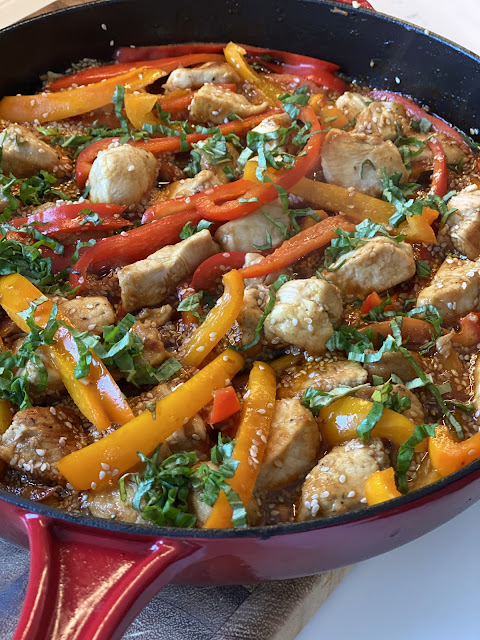 Remove from the heat and stir in the basil. Serve the chicken and sauce over bowls of rice. Top with cashews, additional basil, and cucumbers, if desired. Enjoy!