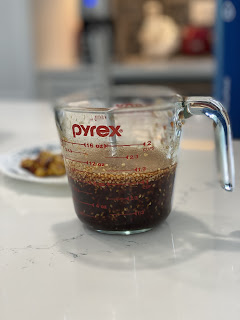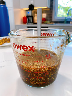 Combine 1/4 cup honey, soy sauce, fish sauce, chili paste, ketchup, and sesame seeds.