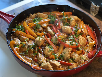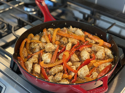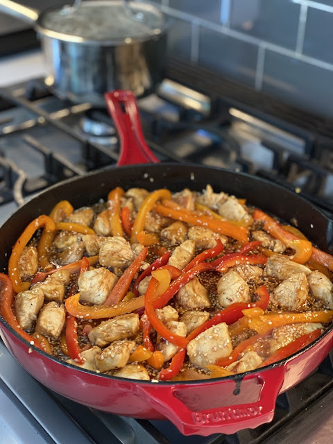Add garlic, ginger, and peppers, cook another 2-3 minutest. Pour in the sauce and bring to a boil over medium-high heat.