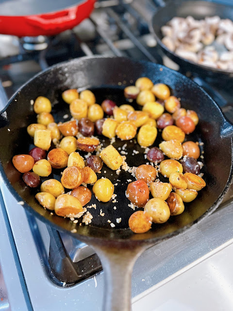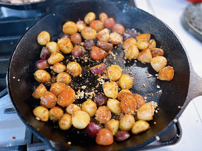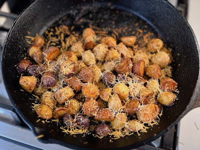 Heat up a cast-iron or oven-safe skillet and add the oil. Add the potatoes and cook until the surface turns crispy. Toss until nicely browned.
