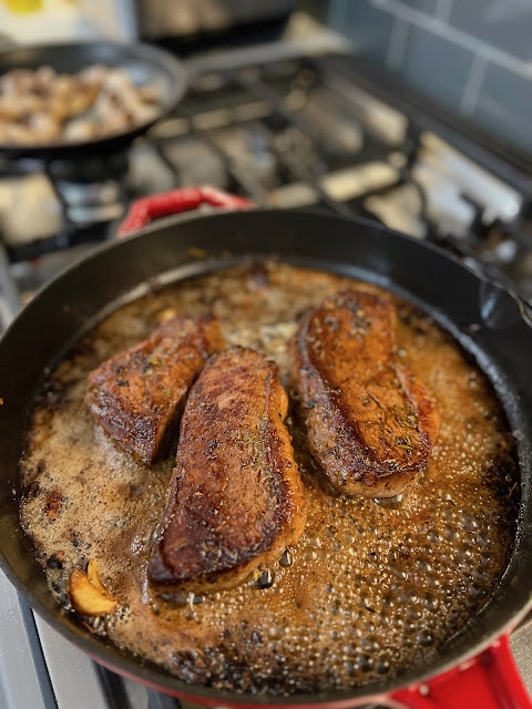 Heat a cast iron skillet over medium/high heat and melt butter. Add oil.