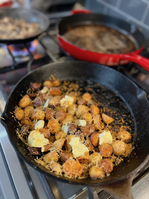 Transfer the skillet into the oven, roast for 15 minutes. Add the butter cubes on top of the potatoes, serve immediately.