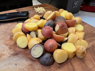 Preheat the oven to 400°F. Clean and rinse the baby potatoes, drain and cut into halves.