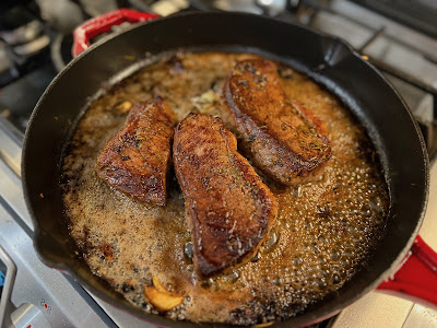Meanwhile, cook the wine until reduced and a kind of sauce if formed.