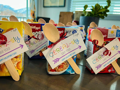 I printed cards from Surviving a Teacher’s Salary, bought mini cereal boxes & bamboo spoons from Superstore and double sided tape and red ribbon from the Dollarstore and TA-DA! 25 adorable Valentine’s treats for SBean’s last class Valentine Party!