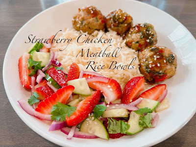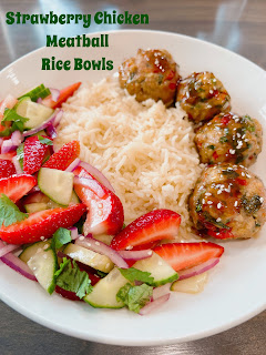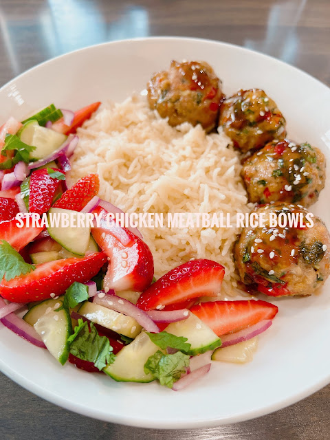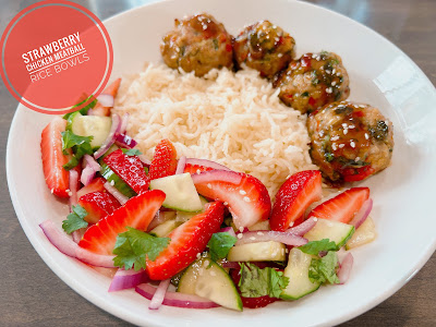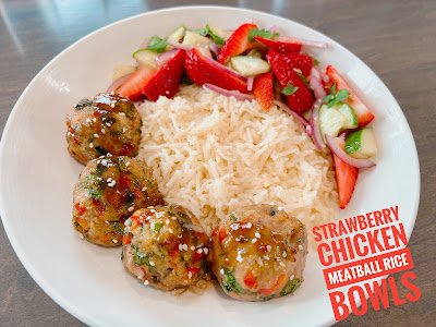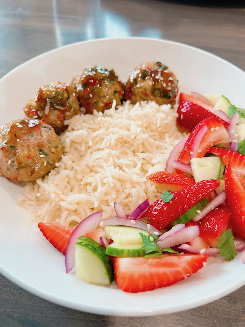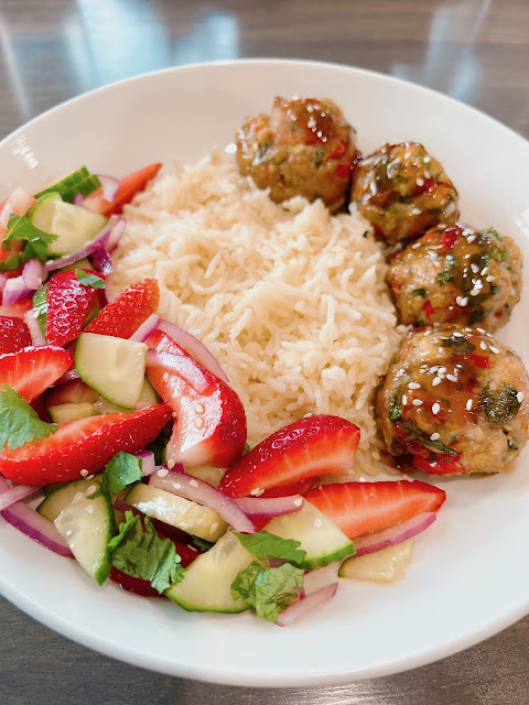 Divide rice between 4 bowls. Add 3-5 meatballs to one side of each bowl. Spoon some of the sauce over the meatballs and sprinkle with sesame seeds and chopped cilantro. Add the salad. Drizzle any extra dressing over the salad.